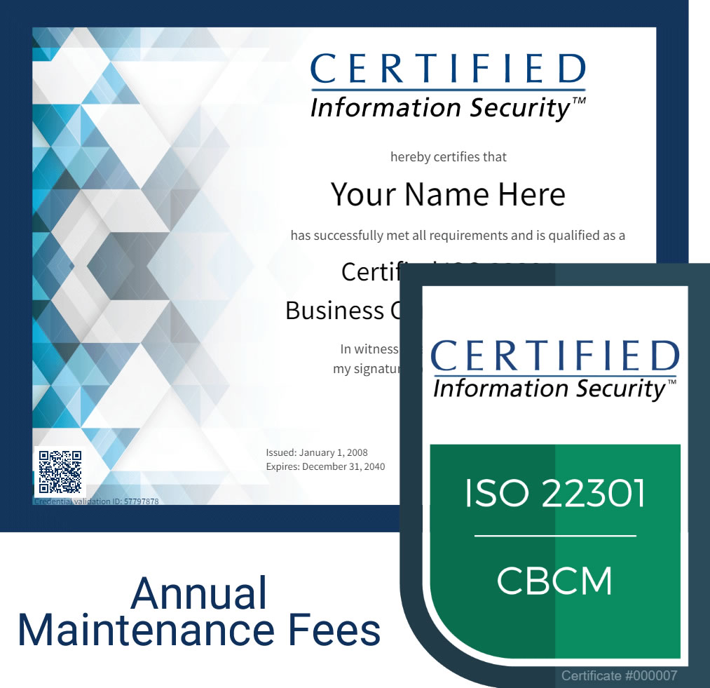 - All necessary renewal AMF fees, including those for ISO 31000 CICRA, ISO 22301 CBCS, and ISO 22301 CBCM are already included in the "Complete CBCM, CBCS and CICRA Annual Maintenance Fees (AMF) Renewal Package".